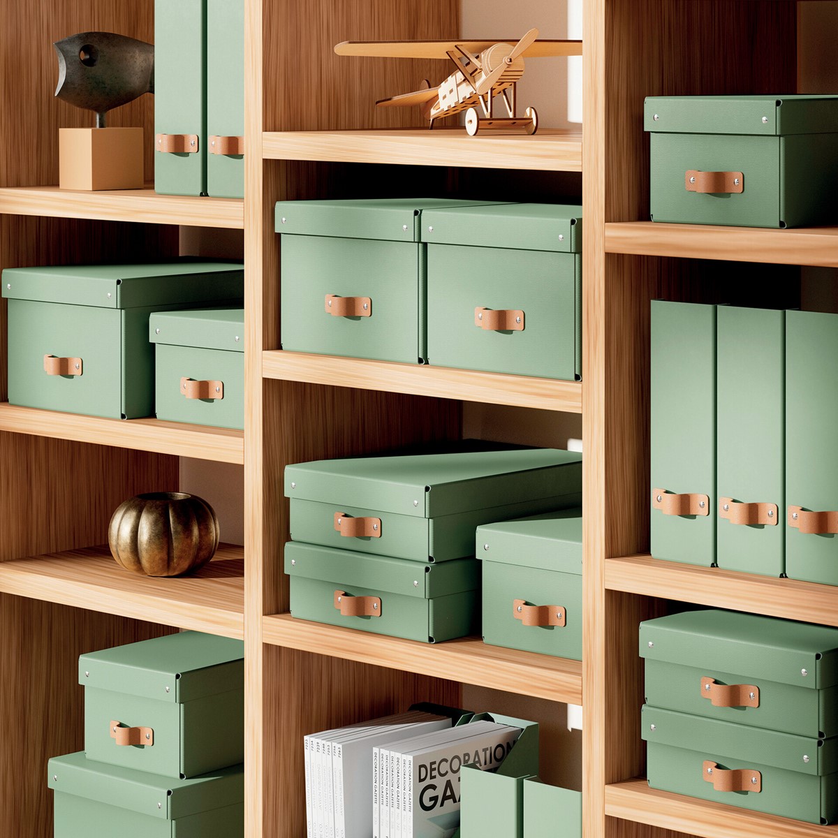 • Dank des eleganten Ledergriffs lassen sich die Stehsammler aus Karton leicht aus Regalen, Schränken und Garderoben entnehmen