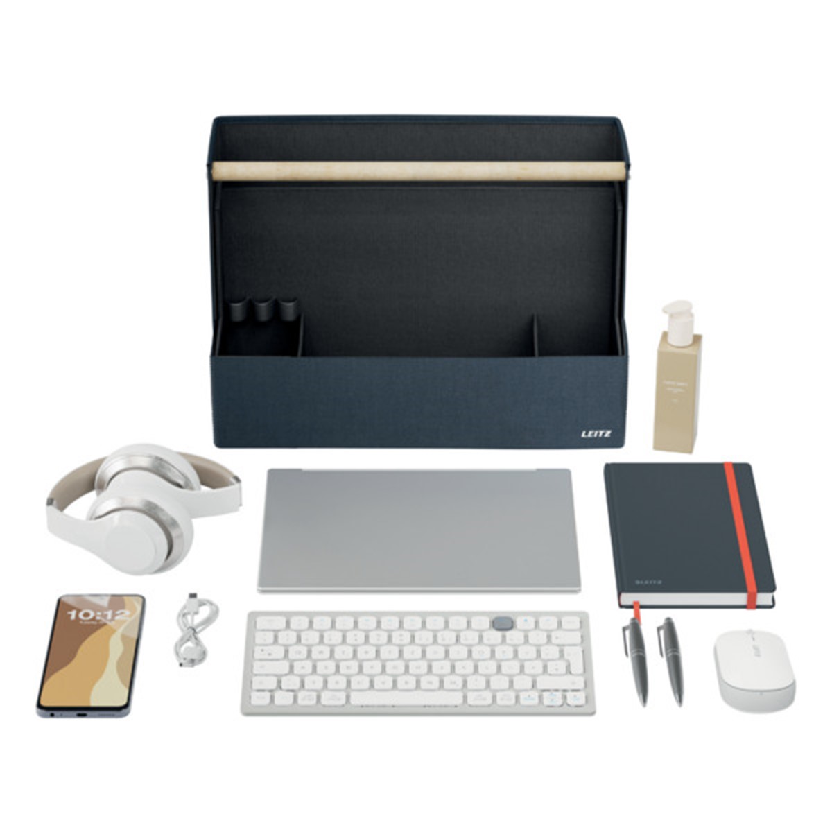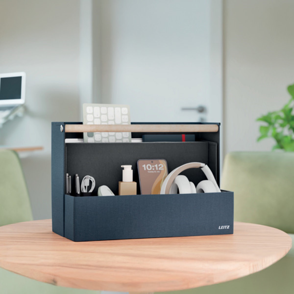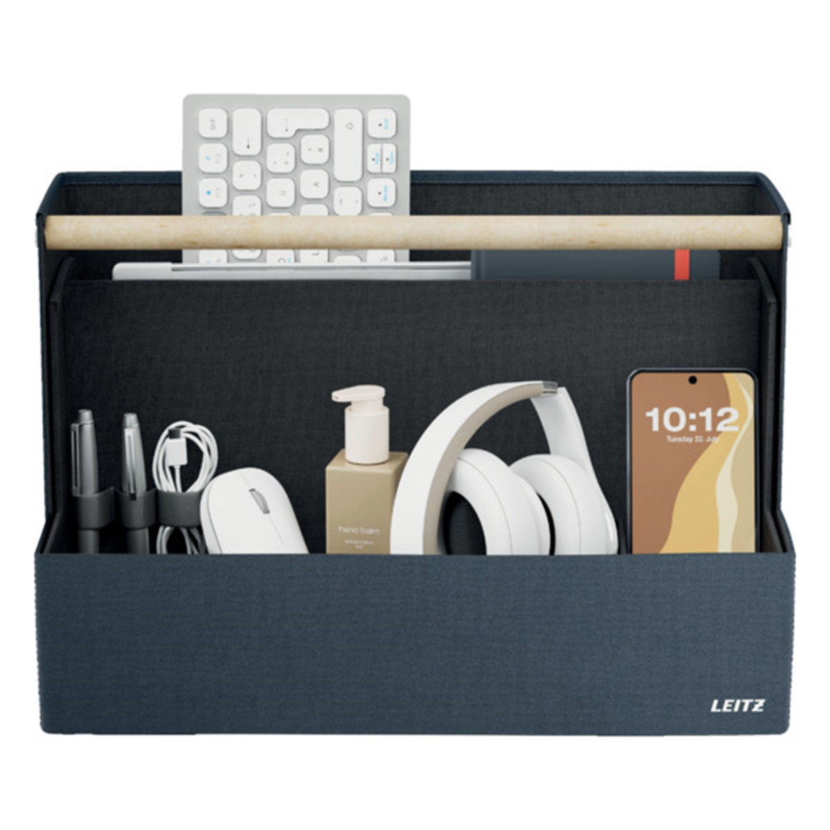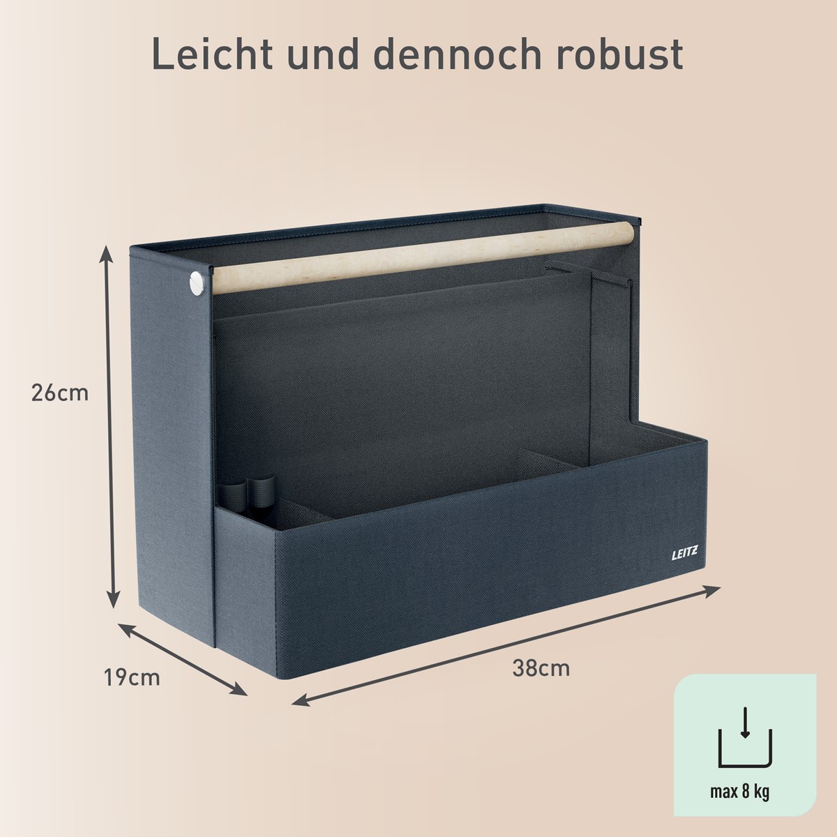 Fühlen Sie Sich mit der Leitz Aufbewahrungsserie aus Stoff überall dort wie Zuhause, wo der Tag Sie hinführt. Mit dem minimalistischen Design und der einladenden matten, samtgrauen Oberfläche können Sie im Büro, zu Hause, beim hybriden Arbeiten oder überall dazwischen stilvoll auftreten und gleichzeitig organisiert bleiben. Der Leitz Schreibtisch Organizer aus Stoff verfügt über vier separate Fächer, in denen Sie alles unterbringen können, was Sie für den kommenden Tag benötigen.