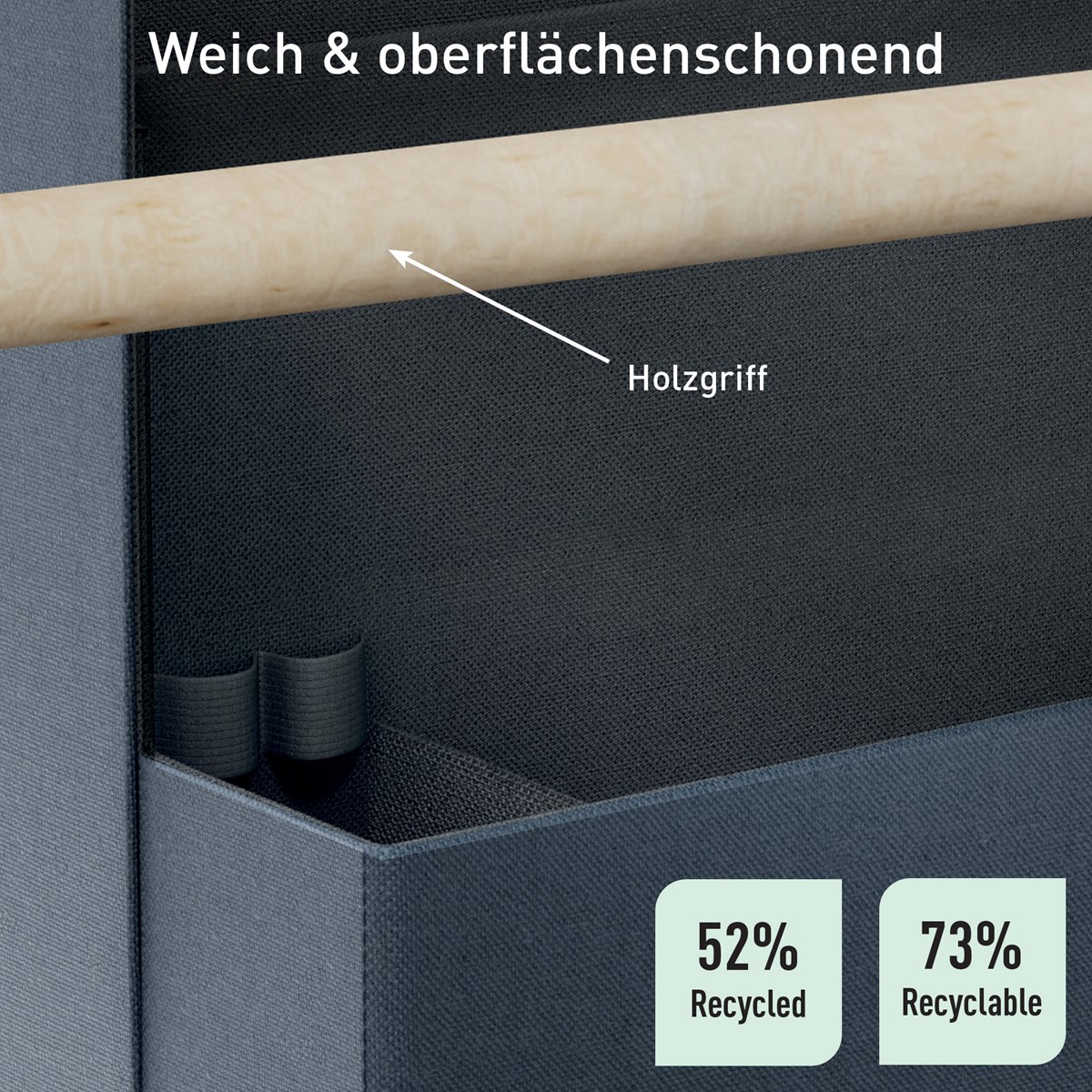 Das weiche Material schützt Ihre Ausrüstung vor Kratzern und ist mit recycelter Pappe verstärkt, um Stabilität und Haltbarkeit zu gewährleisten. Insgesamt 52% recycelte Materialien.