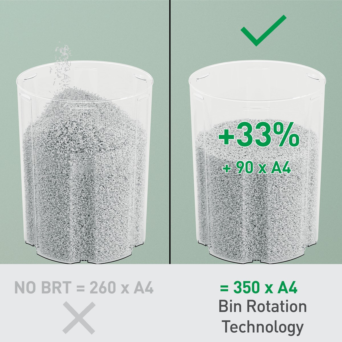 • Der großzügige 22-Liter-Behälter fasst bis zu 350 A4-Blätter, bevor er geleert werden muss; +33 % mehr Kapazität im Vergleich zu einem Behälter ohne BRT (+90 A4-Blätter).