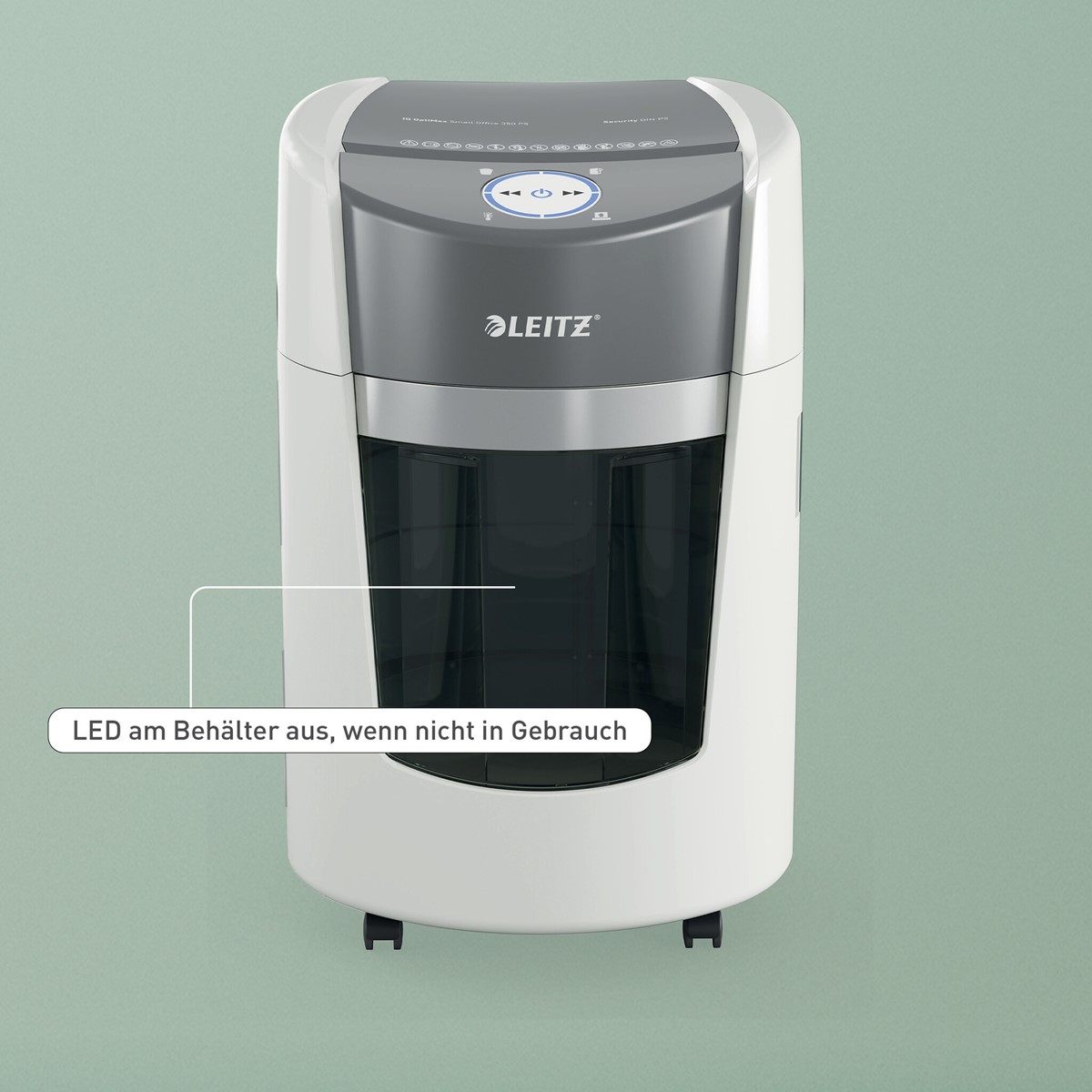 Der Leitz IQ OptiMax Aktenvernichter für kleine Büros ist eine innovative, elegante Lösung, die für außergewöhnliche Dokumentensicherheit sorgt und Ihnen ein gutes Gefühl gibt. Dieser hochsichere DIN P-5 Aktenvernichter zerkleinert mühelos bis zu 8 A4-Blätter auf einmal in mikrogeschnittene Partikel und ist damit der perfekte kleine Aktenvernichter für den privaten und beruflichen Gebrauch. Ausgestattet mit der einzigartigen Behälterrotationstechnologie (BRT), die das Fassungsvermögen des Behälters effektiv um +33%* erhöht. Der drehbare Auffangbehälter sorgt für eine flache, gleichmäßige Verteilung des Papiers, verhindert die Bildung von Pyramiden und ermöglicht die Zerkleinerung von 90x A4-Blättern vor der Entleerung. Dank BRT muss der Behälter nicht mehr manuell geschüttelt oder entnommen werden - die Anzeige "Behälter voll" wird erst bei 100 % Kapazität aktiviert. Mit einem großzügigen 22-Liter-Behälter, der bis zu 350 A4-Blätter fasst, sorgt dieser Aktenvernichter für weniger Unterbrechungen. Der blau beleuchtete Auffangbehälter und das intuitive LED-Display geben klare, leicht verständliche Warnungen aus, z. B. "Auffangbehälter voll" und "Tür offen", und sorgen so für eine einfache und effiziente Zerkleinerung. Der Leitz IQ OptiMax 350 Büro-Aktenvernichter wurde speziell für kleine Büros entwickelt und arbeitet besonders geräuscharm - ideal für Gemeinschaftsräume. Sein schlankes, kompaktes, rundes Design passt problemlos in enge Räume und fügt sich nahtlos in jede Büroeinrichtung ein. Mit einer 20-minütigen Dauerlaufzeit sorgt diese zuverlässige Aktenvernichtungsmaschine für eine reibungslose Aktenentsorgung, wann immer sie gebraucht wird. Farbe: Weiß