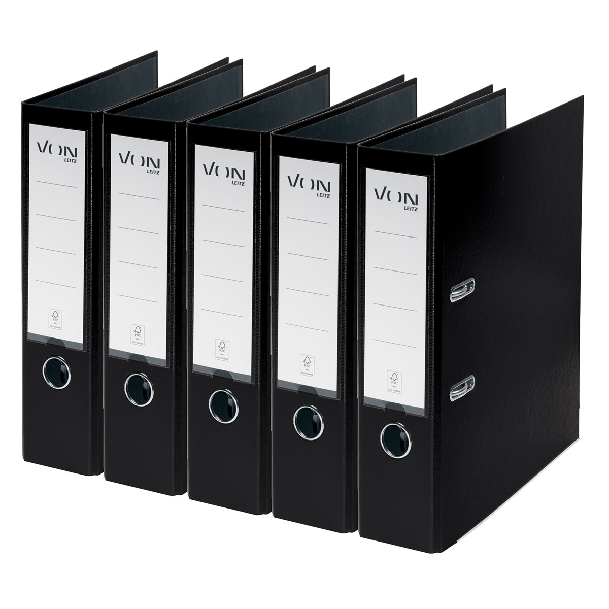 5er-Pack moderne und funktionale Ordner für die ganze Familie und für jeden Tag. Diese A4-Ordner aus Kunststoff fassen bis zu 600 Blatt und sind die perfekte Lösung für die Ablage in der Schule, im Studium oder bei der Arbeit zu Hause. Die stabile VON Ordner-Mechanik sorgt dafür, dass alle Unterlagen sicher aufbewahrt werden und leicht zugänglich sind. Mit dem langlebigen und abwischbaren Kunststoffeinband eignen sich diese A4-Ordner für alltägliche Ablageaufgaben wie die Organisation von Haushaltsrechnungen oder die farbliche Kennzeichnung von Projekten. Hergestellt aus stabilem und haltbarem FSC-zertifiziertem Karton für hohe Leistung und Effizienz. Qualität für jeden Tag - von Leitz.