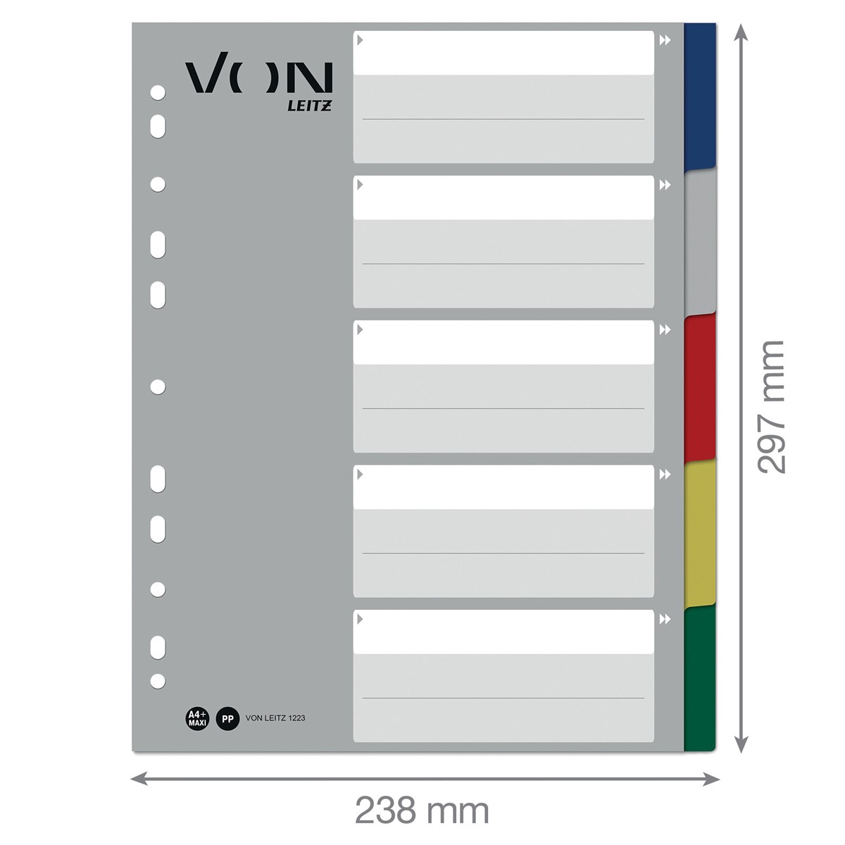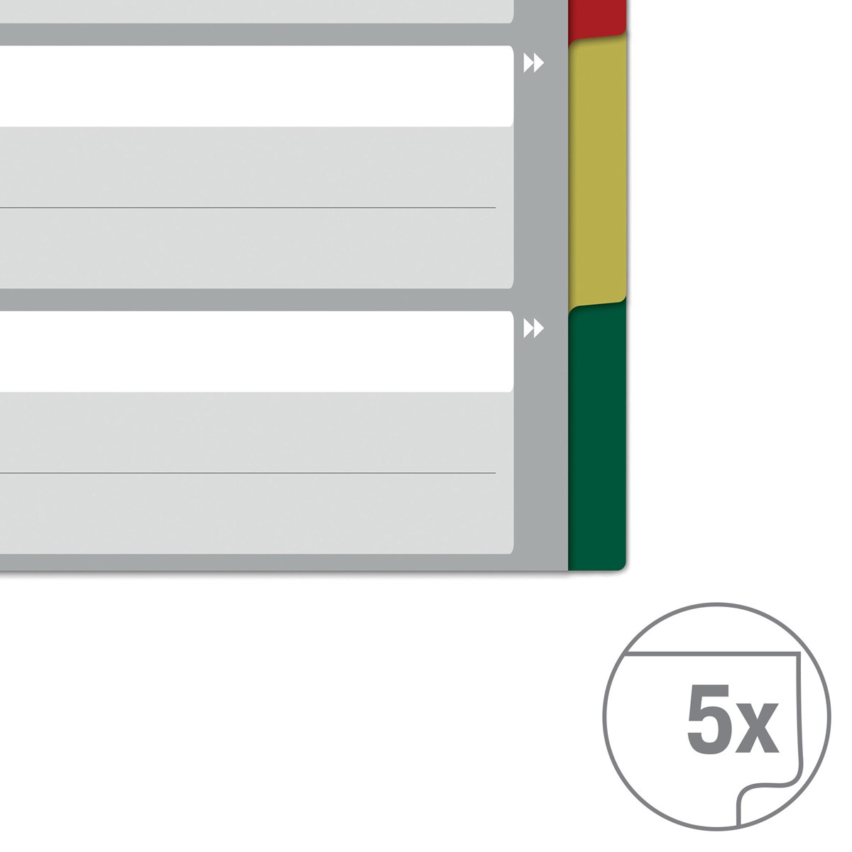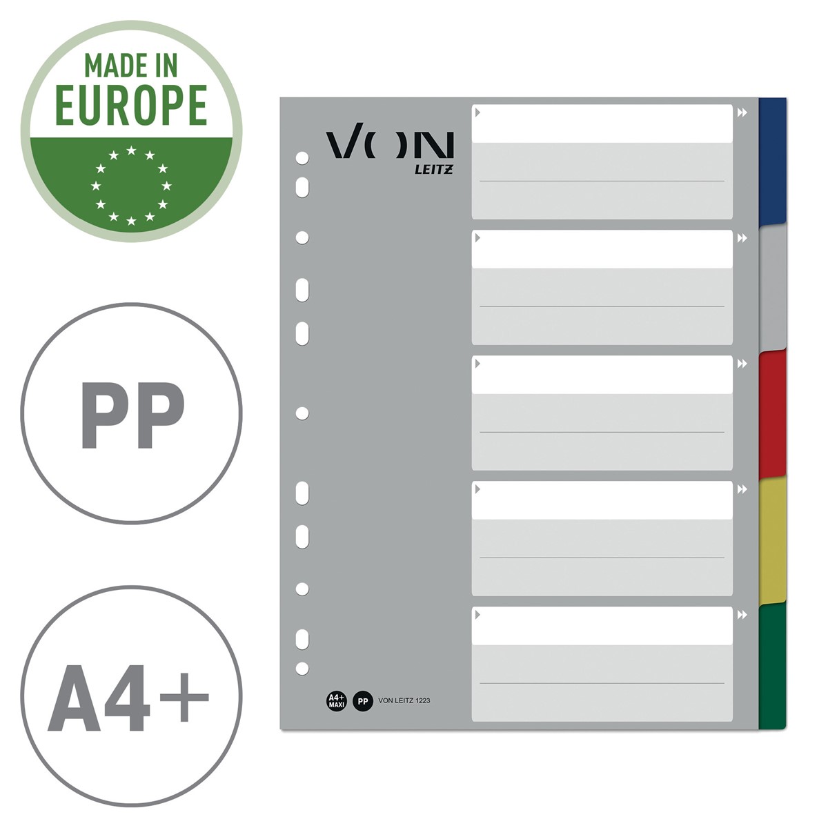 Registerblätter in leuchtenden Farben für die ganze Familie und für den täglichen Gebrauch. Diese A4-Register in Überbreite sind die perfekte Lösung für die strukturierte Ablage von Unterlagen in der Schule, im Studium oder bei der Arbeit zu Hause. Mit 5 farbigen Taben und einem bedruckten Deckblatt mit viel Platz für die persönliche Gestaltung. Das Format A4 Überbreite ermöglicht die Verwendung des Registers auch mit Prospekthüllen, was sie ideal für die tägliche Ablage macht, z. B. für die Organisation von Haushaltsrechnungen oder die Präsentation von Schulprojekten. Hergestellt aus haltbarem, abwischbarem Polypropylen und stabilem Karton für hohe Leistung und Effizienz. Everyday quality - von Leitz.