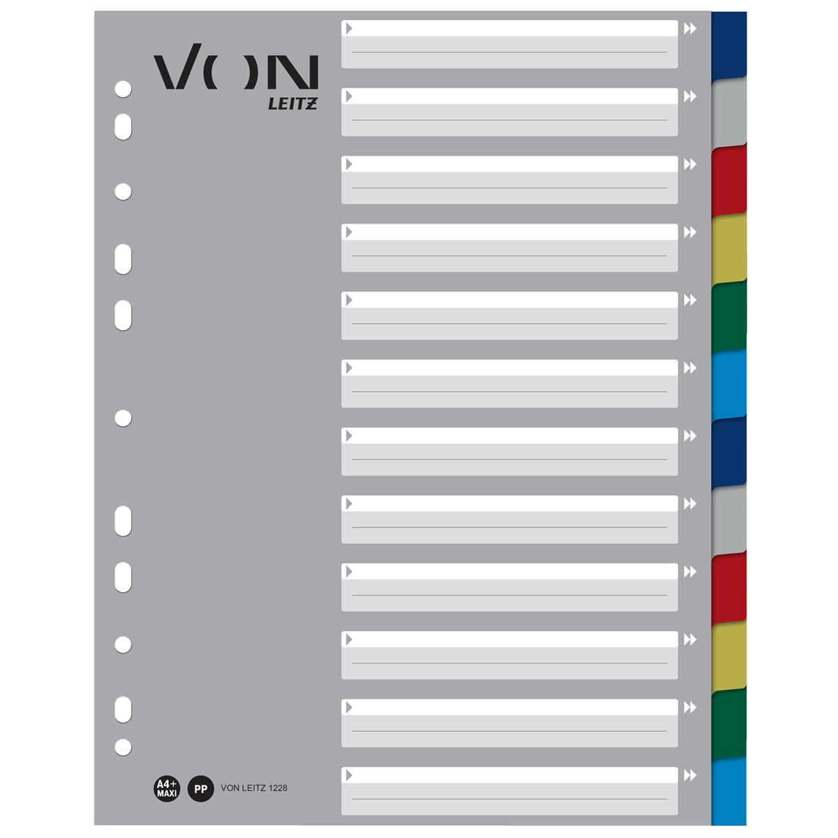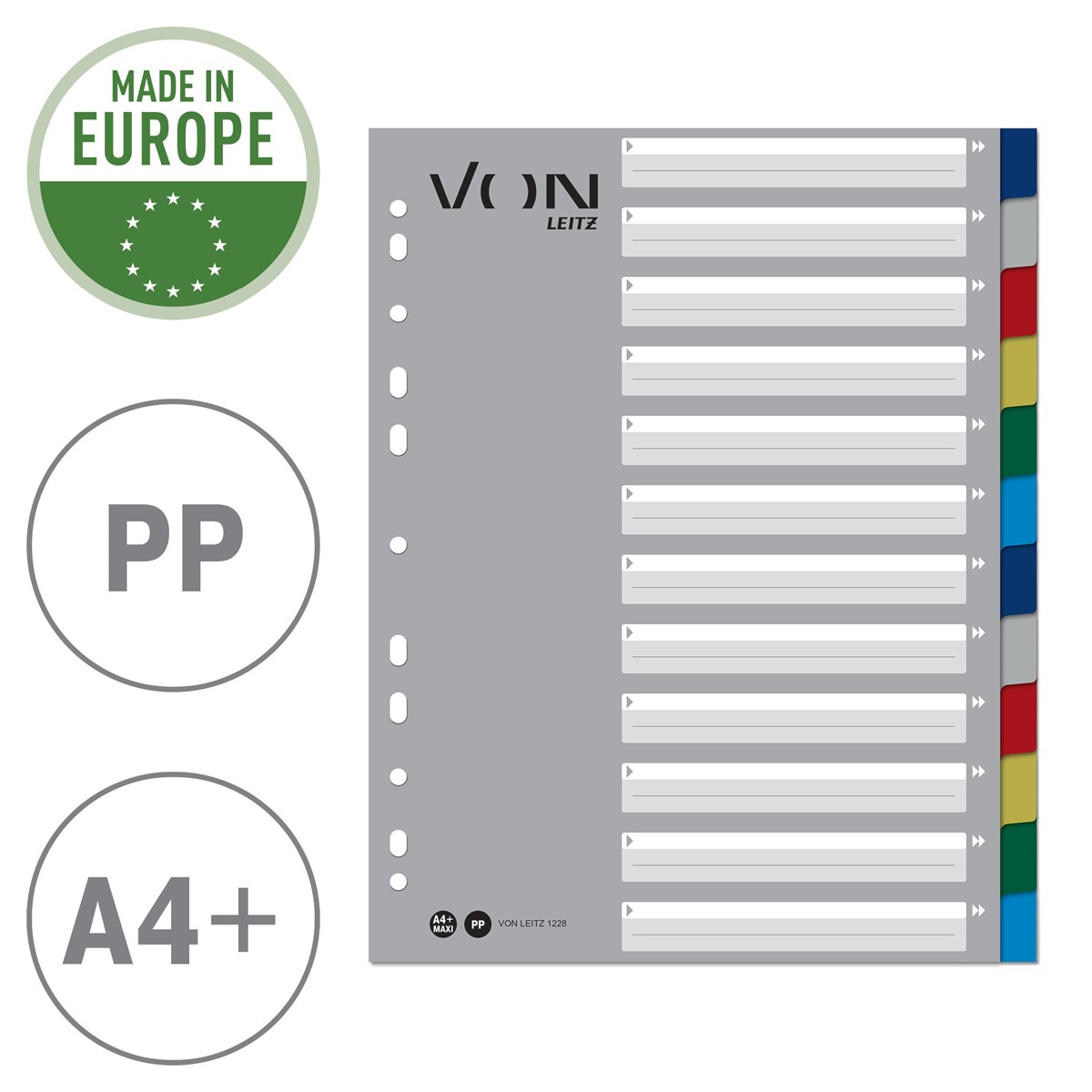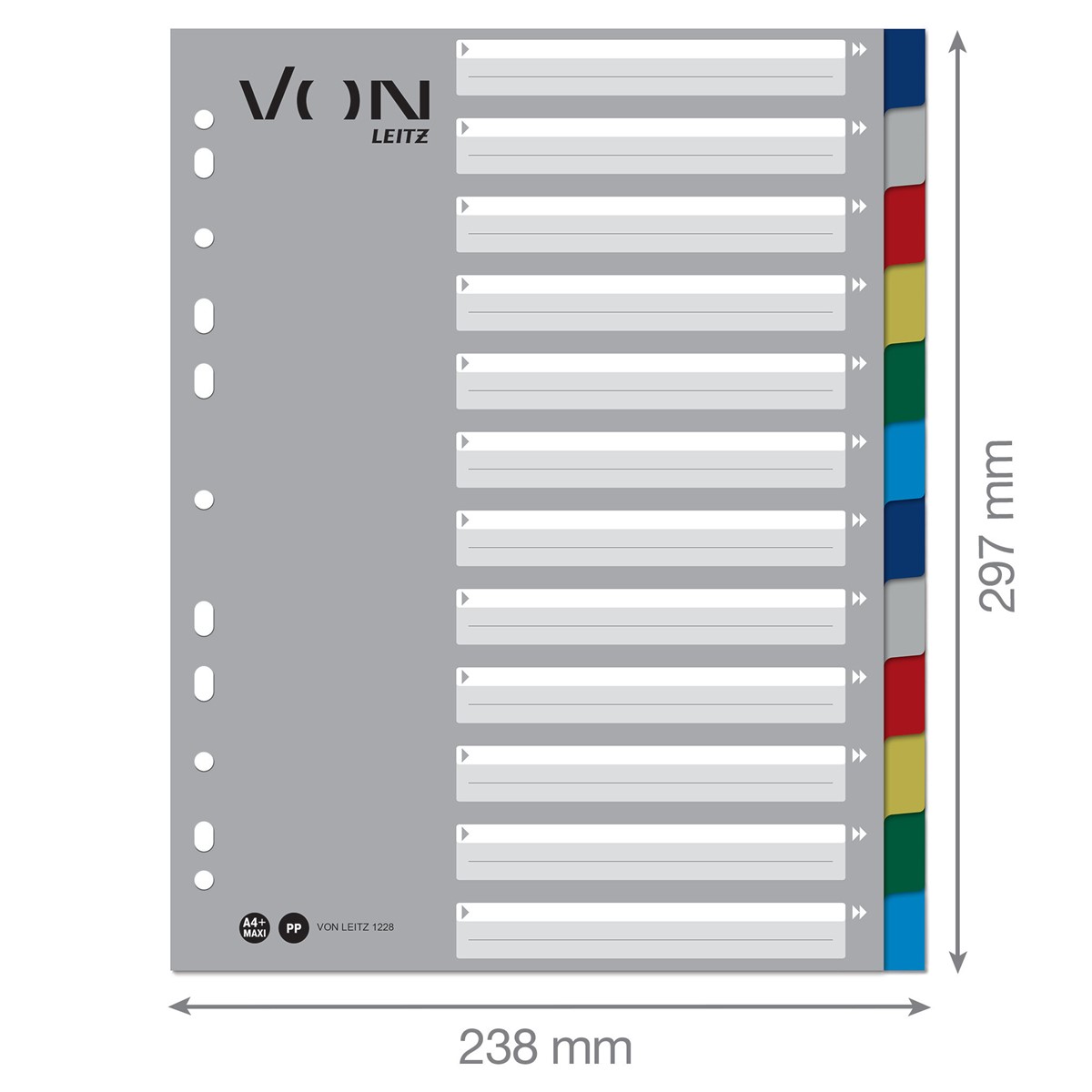 Registerblätter in leuchtenden Farben für die ganze Familie und für den täglichen Gebrauch. Diese A4-Register in Überbreite sind die perfekte Lösung für die strukturierte Ablage von Unterlagen in der Schule, im Studium oder bei der Arbeit zu Hause. Mit 12 farbigen Taben und einem bedruckten Deckblatt mit viel Platz für die persönliche Gestaltung. Das Format A4 Überbreite ermöglicht die Verwendung des Registers auch mit Prospekthüllen, was sie ideal für die tägliche Ablage macht, z. B. für die Organisation von Haushaltsrechnungen oder die Präsentation von Schulprojekten. Hergestellt aus haltbarem, abwischbarem Polypropylen und stabilem Karton für hohe Leistung und Effizienz. Everyday quality - von Leitz.