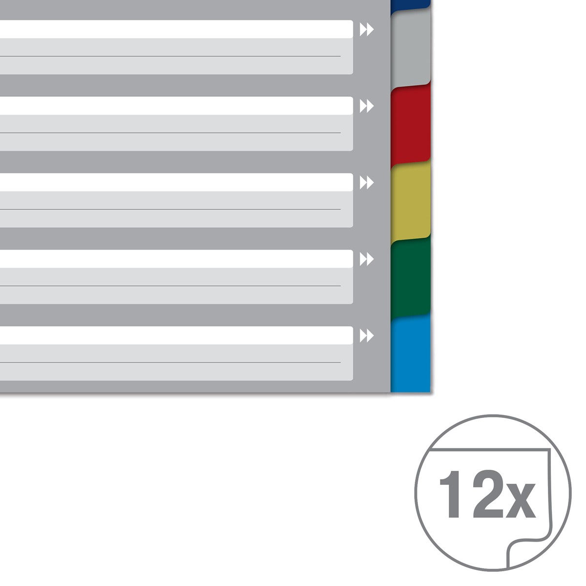 • Mit 12 blanko Registern aus Kunststoff in verschiedenen Farben für eine übersichtliche Ablage und leichtes Auffinden von Unterlagen
