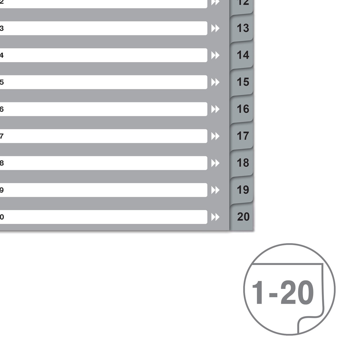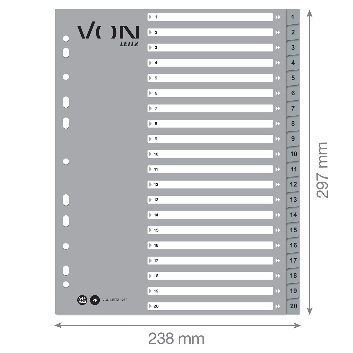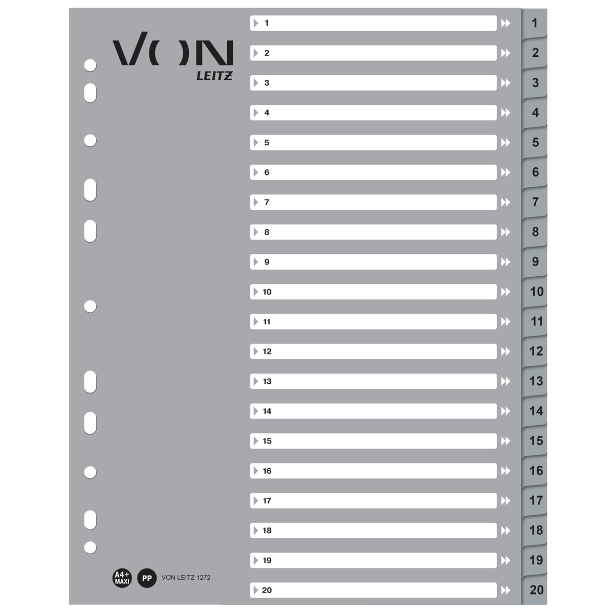 Registerblätter mit Zahlenaufdruck für die ganze Familie und für den täglichen Gebrauch. Diese A4-Register in Überbreite sind die perfekte Lösung für die strukturierte Ablage von Unterlagen in der Schule, im Studium oder bei der Arbeit zu Hause. Mit grauen Trennblättern von 1-20 und einem bedruckten Deckblatt mit viel Platz für die persönliche Gestaltung. Das A4-Format mit Überbreite ermöglicht die Verwendung des Registers auch mit Prospekthüllen, was sie ideal für die tägliche Ablage macht, z. B. für die Organisation von Haushaltsrechnungen oder die Präsentation von Schulprojekten. Hergestellt aus haltbarem, abwischbarem Polypropylen und stabilem Karton für hohe Leistung und Effizienz. Everyday quality - von Leitz.