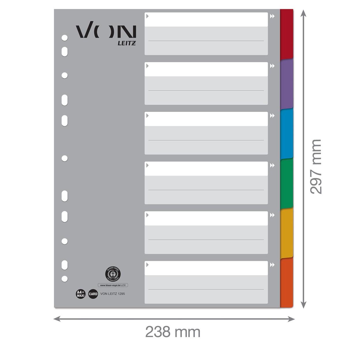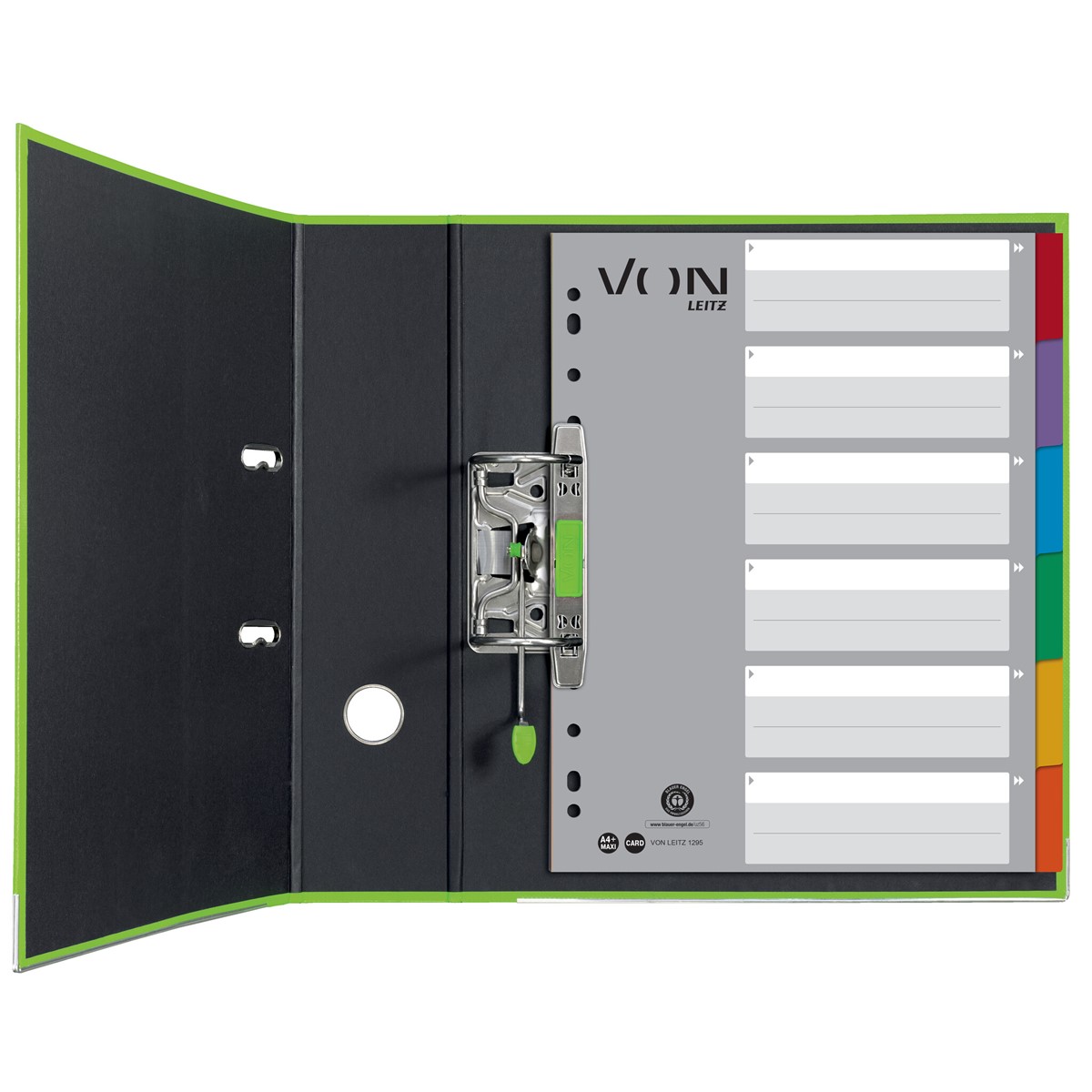 • Mit 6 blanko Registern aus Karton in verschiedenen Farben für eine übersichtliche Ablage und leichtes Auffinden von Unterlagen