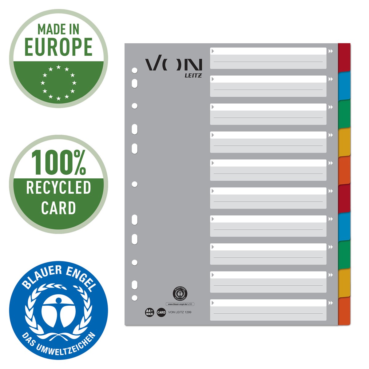 Registerblätter in leuchtenden Farben für die ganze Familie und für den täglichen Gebrauch. Diese A4-Register in Überbreite sind die perfekte Lösung für die strukturierte Ablage von Unterlagen in der Schule, im Studium oder bei der Arbeit zu Hause. Mit 10 farbigen Taben aus Karton und einem bedruckten Deckblatt mit viel Platz für die persönliche Gestaltung. Das Format A4 Überbreite ermöglicht die Verwendung des Registers auch mit Prospekthüllen, was sie ideal für die tägliche Ablage macht, z. B. für die Organisation von Haushaltsrechnungen oder die Präsentation von Schulprojekten. Hergestellt aus 100 % recyceltem Karton, der mit dem Blauen Engel ausgezeichnet ist und somit eine umweltfreundliche Wahl darstellt. Everyday quality - von Leitz.