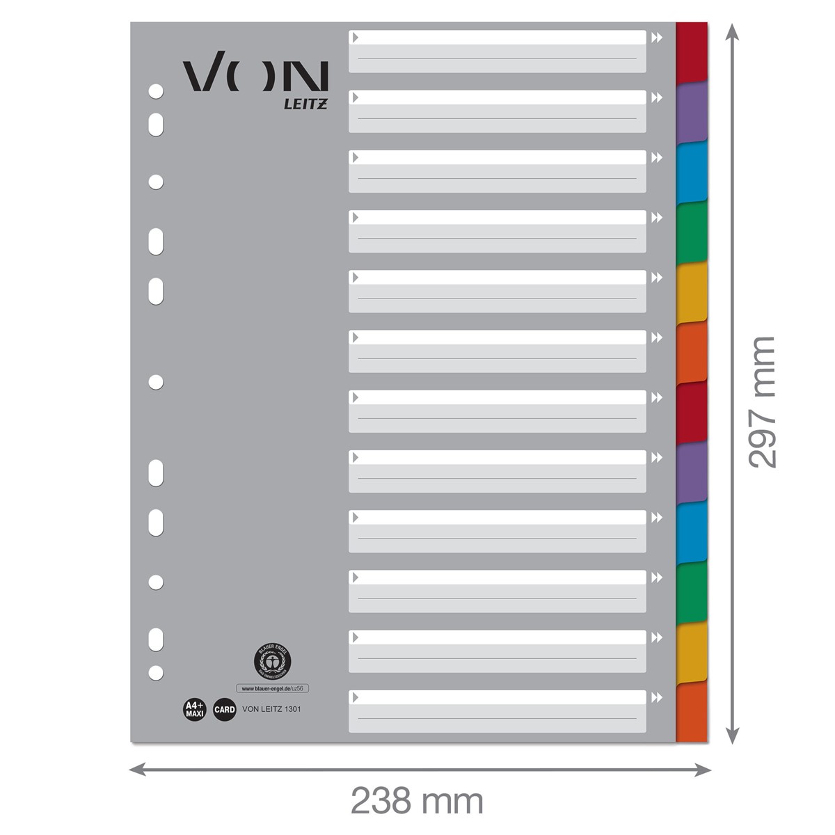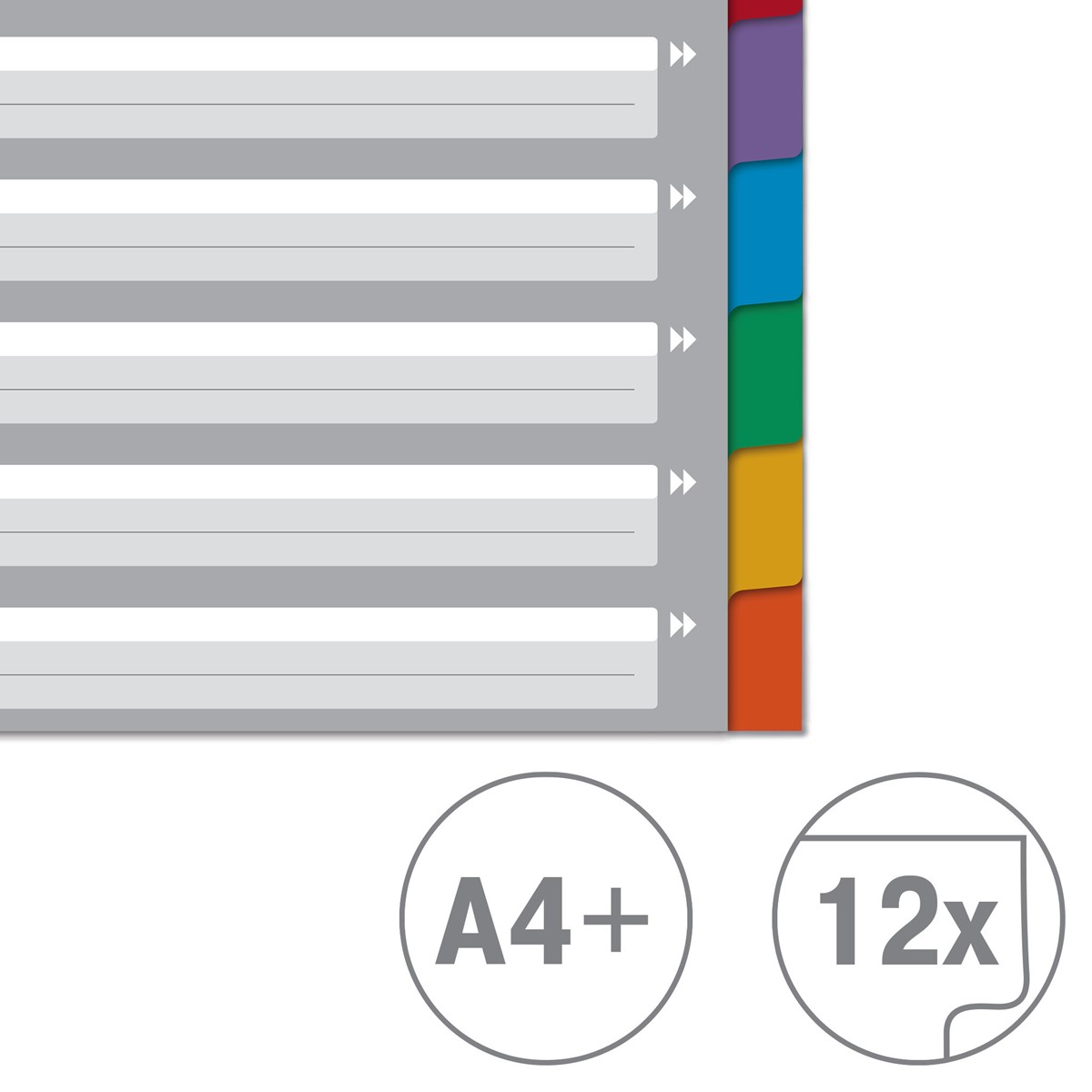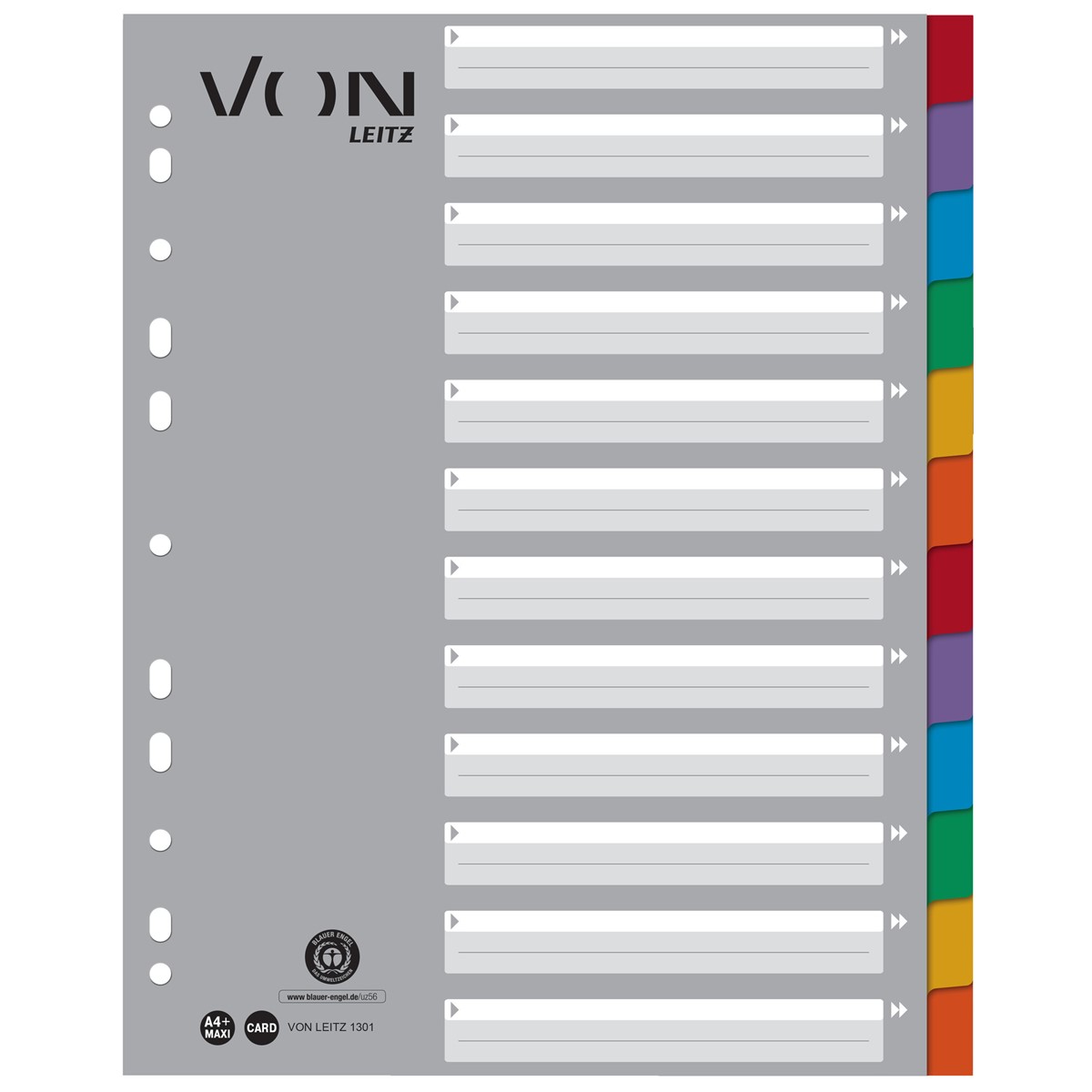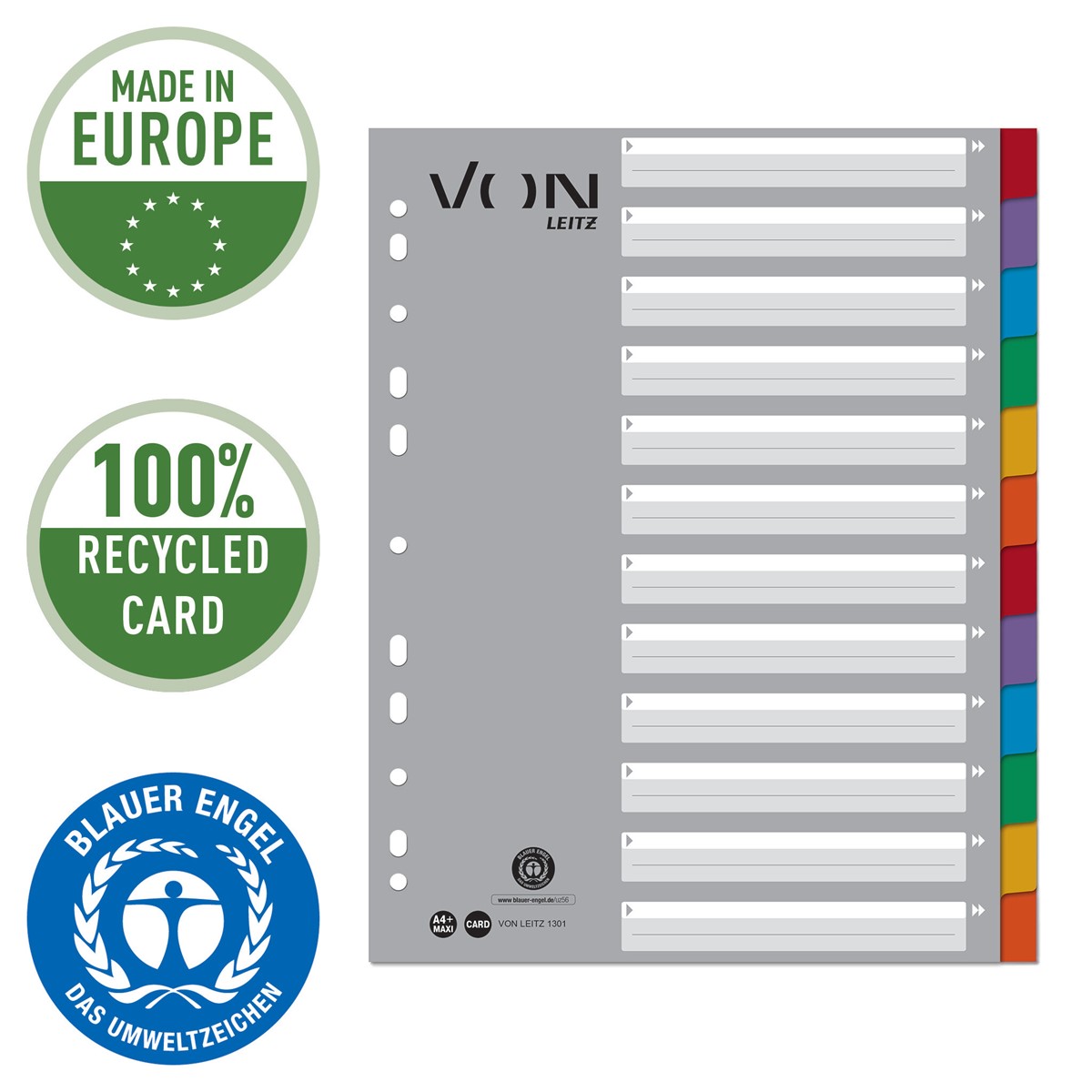 Registerblätter in leuchtenden Farben für die ganze Familie und für den täglichen Gebrauch. Diese A4-Register in Überbreite sind die perfekte Lösung für die strukturierte Ablage von Unterlagen in der Schule, im Studium oder bei der Arbeit zu Hause. Mit 12 farbigen Taben aus Karton und einem bedruckten Deckblatt mit viel Platz für die persönliche Gestaltung. Das Format A4 Überbreite ermöglicht die Verwendung des Registers auch mit Prospekthüllen, was sie ideal für die tägliche Ablage macht, z. B. für die Organisation von Haushaltsrechnungen oder die Präsentation von Schulprojekten. Hergestellt aus 100 % recyceltem Karton, der mit dem Blauen Engel ausgezeichnet ist und somit eine umweltfreundliche Wahl darstellt. Everyday quality - von Leitz.