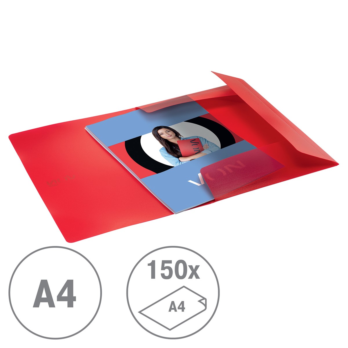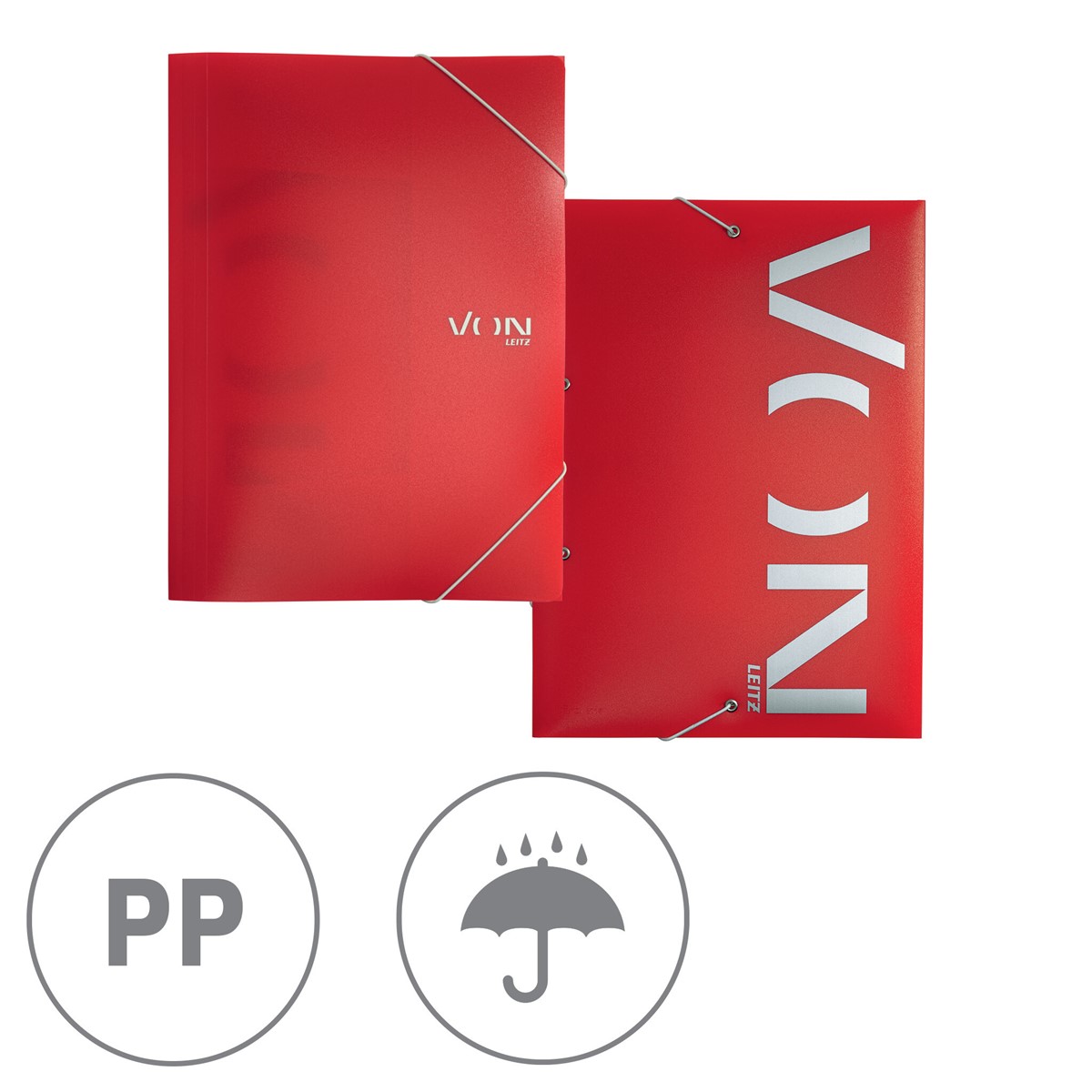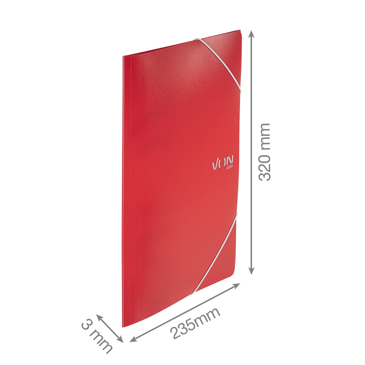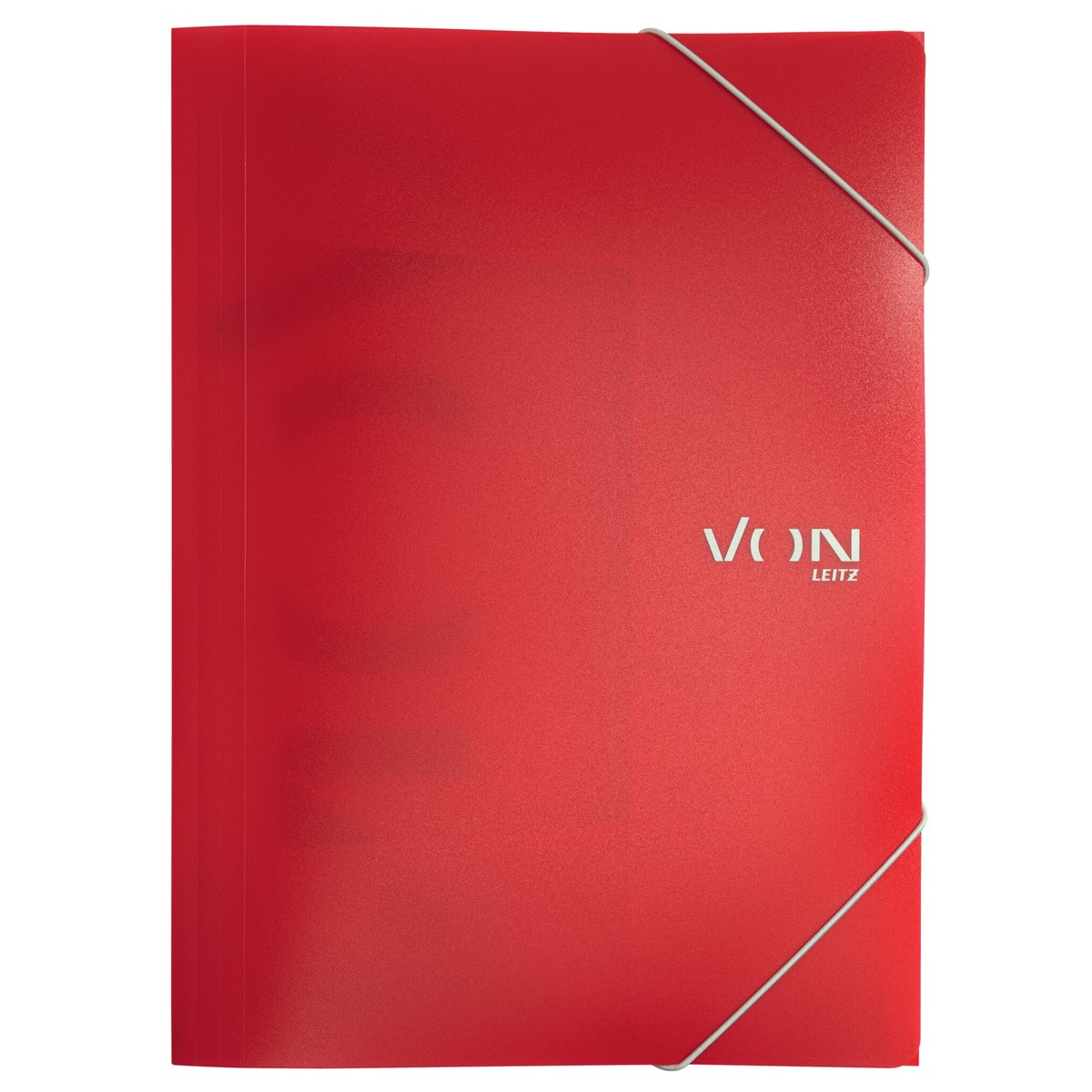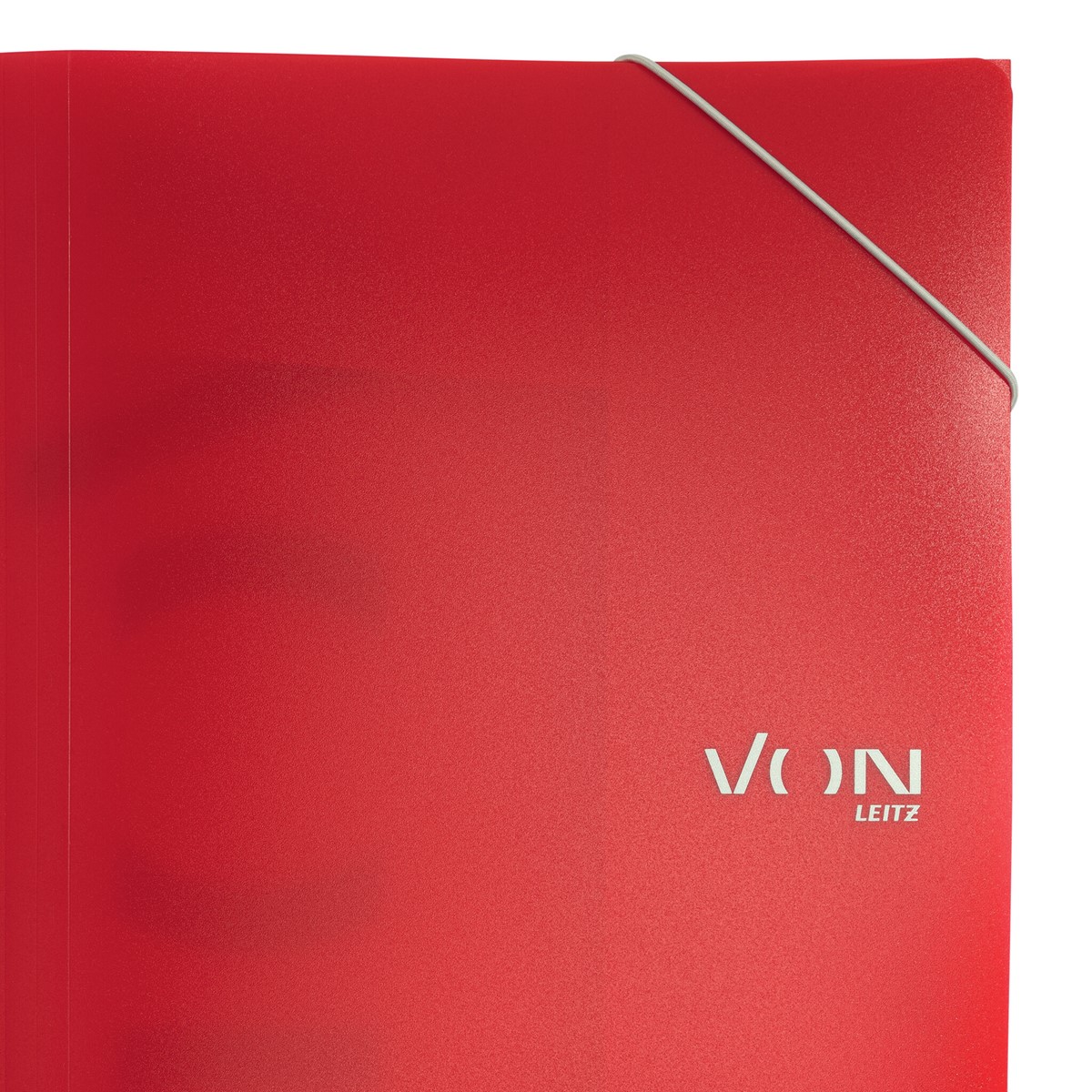 Moderne und funktionale A4-Eckspannermappe für die ganze Familie und für jeden Tag. Diese A4-Mappe ist die perfekte Lösung zur Ablage von Unterlagen für das Studium und Home Office oder für unterwegs. Sie verfügt über 3 Klappen innen und einem Gummizug, um Unterlagen zu schützen und leicht zugänglich zu machen. Diese langlebigen Kunststoffmappen im A4-Format eignen sich zum Ordnen und Aufbewahren alltäglicher Unterlagen wie Haushaltsrechnungen, Broschüren oder Projektarbeiten. Hergestellt aus durchsichtigem, abwischbarem Polypropylen und erhältlich in einer Auswahl klassischer Farben mit einem modernen silbernen Aufdruck des VON-Designs. Everyday quality - von Leitz.