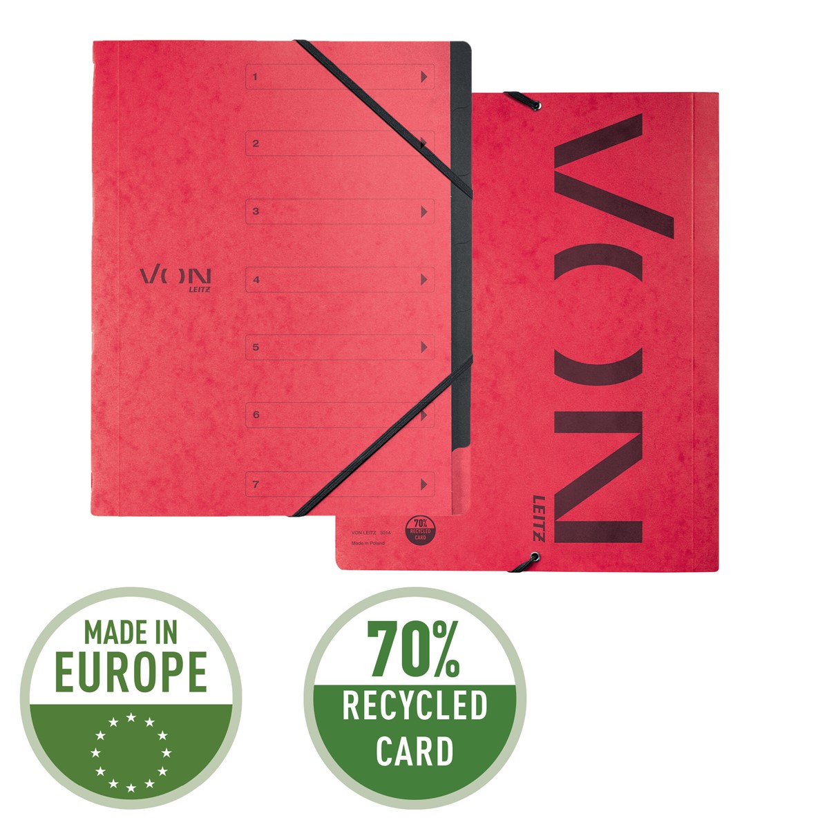 Moderne und funktionale A4-Ordnungsmappe mit Fächern für die ganze Familie und für jeden Tag. Diese Ordnungsmappe mit Fächern und Taben ist die perfekte Lösung für die Ablage im Studium oder bei der Arbeit zu Hause und unterwegs. Sie verfügt über 6 Fächer mit farbigen Taben, um die Dokumente nach Kategorien zu ordnen, sowie elastischen Eckbändern, um die Unterlagen beim Transport sicher aufzubewahren. Diese langlebigen Sammelmappen im A4-Format eignen sich zum Ordnen und Aufbewahren alltäglicher Unterlagen wie Haushaltsrechnungen, Korrekturen oder Projektarbeiten. Hergestellt aus 70 % recyceltem Karton zur Wiederverwendung und als umweltfreundliche Alternative. Erhältlich in einer Auswahl klassischer Farben mit einem modernen Aufdruck. Everyday quality - von Leitz.