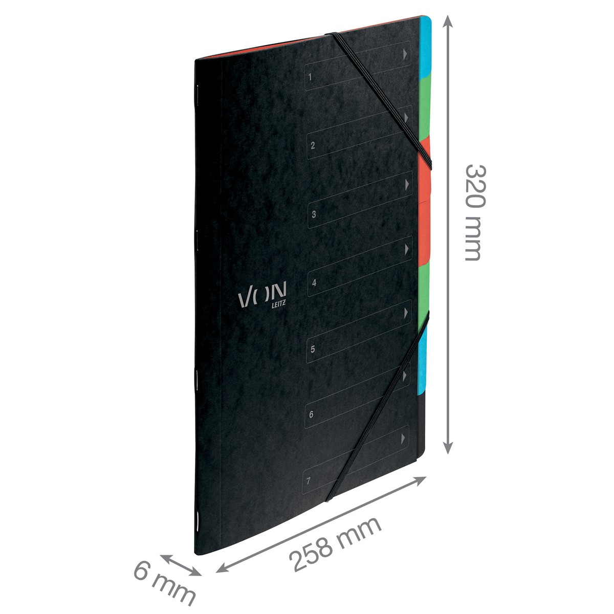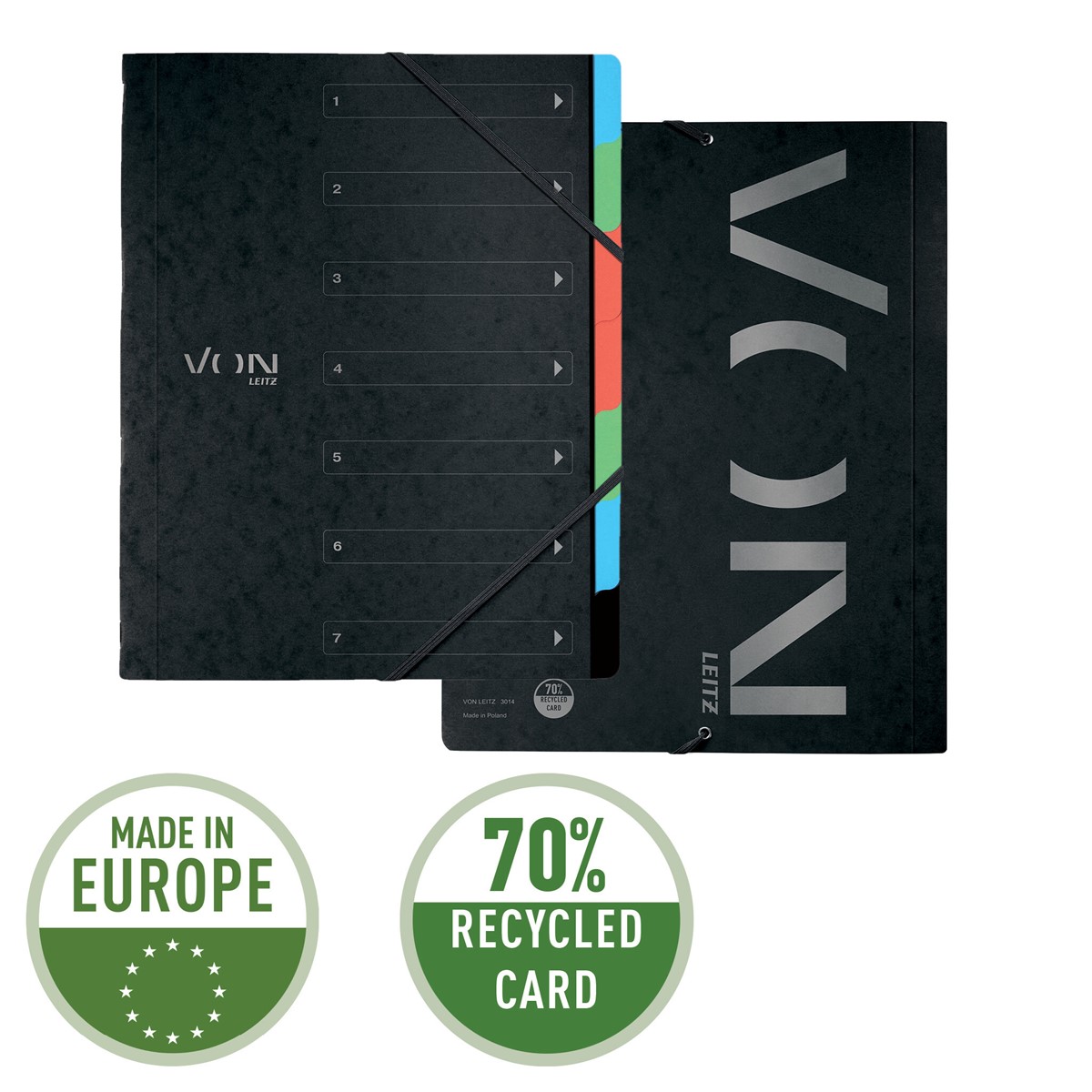 Moderne und funktionale A4-Ordnungsmappe mit Fächern für die ganze Familie und für jeden Tag. Diese Ordnungsmappe mit Fächern und Taben ist die perfekte Lösung für die Ablage im Studium oder bei der Arbeit zu Hause und unterwegs. Sie verfügt über 6 Fächer mit farbigen Taben, um die Dokumente nach Kategorien zu ordnen, sowie elastischen Eckbändern, um die Unterlagen beim Transport sicher aufzubewahren. Diese langlebigen Sammelmappen im A4-Format eignen sich zum Ordnen und Aufbewahren alltäglicher Unterlagen wie Haushaltsrechnungen, Korrekturen oder Projektarbeiten. Hergestellt aus 70 % recyceltem Karton zur Wiederverwendung und als umweltfreundliche Alternative. Erhältlich in einer Auswahl klassischer Farben mit einem modernen Aufdruck. Everyday quality - von Leitz.
