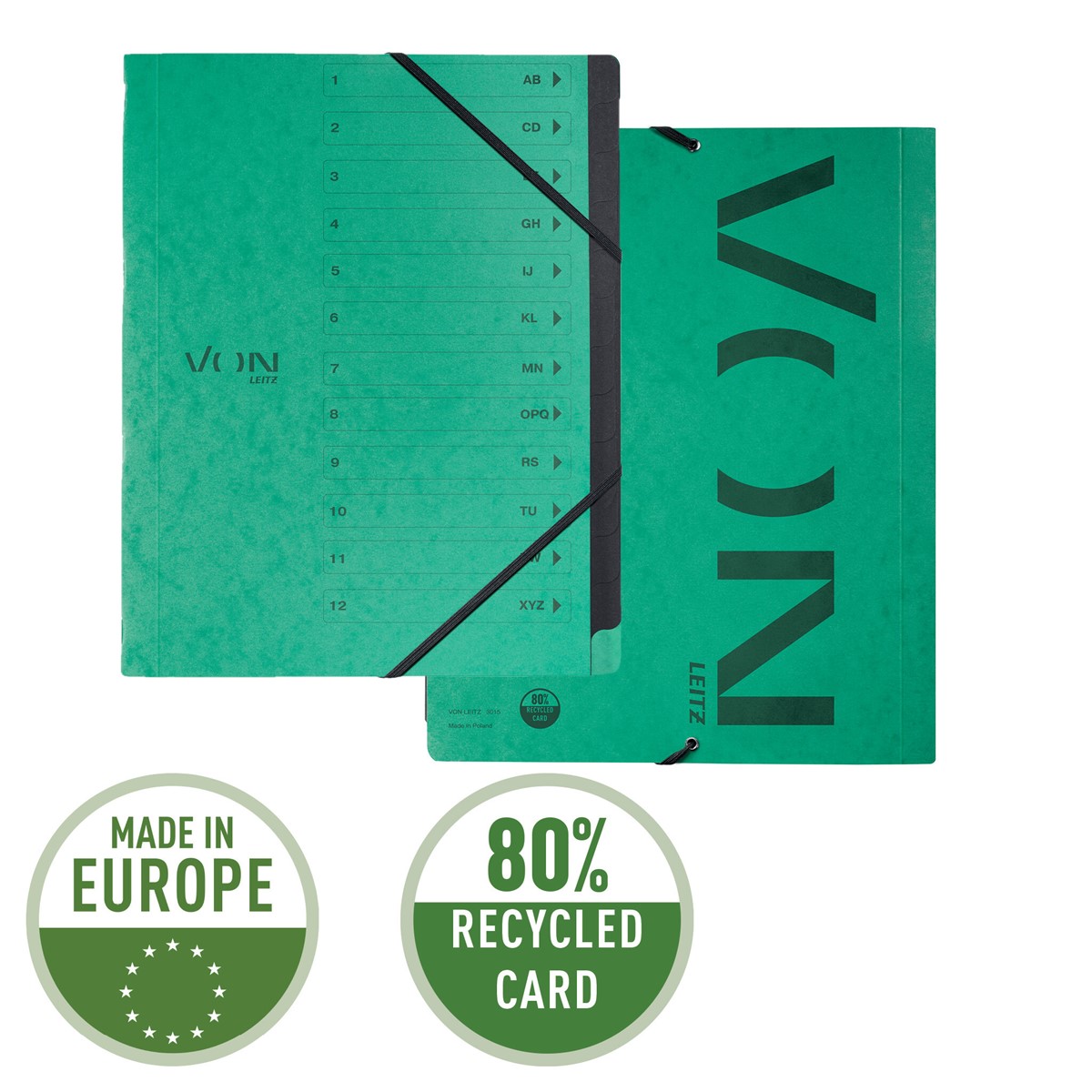 Moderne und funktionale A4-Ordnungsmappe mit Fächern für die ganze Familie und für jeden Tag. Diese Ordnungsmappe mit Fächern und Taben ist die perfekte Lösung für die Ablage im Studium oder bei der Arbeit zu Hause und unterwegs. Sie verfügt über 12 Fächer mit farbigen Taben, um die Dokumente nach Kategorien zu ordnen, sowie elastischen Eckbändern, um die Unterlagen beim Transport sicher aufzubewahren. Diese langlebigen Sammelmappen im A4-Format eignen sich zum Ordnen und Aufbewahren alltäglicher Unterlagen wie Haushaltsrechnungen, Korrekturen oder Projektarbeiten. Hergestellt aus 80 % recyceltem Karton zur Wiederverwendung und als umweltfreundliche Alternative. Erhältlich in einer Auswahl klassischer Farben mit einem modernen Aufdruck. Everyday quality - von Leitz.