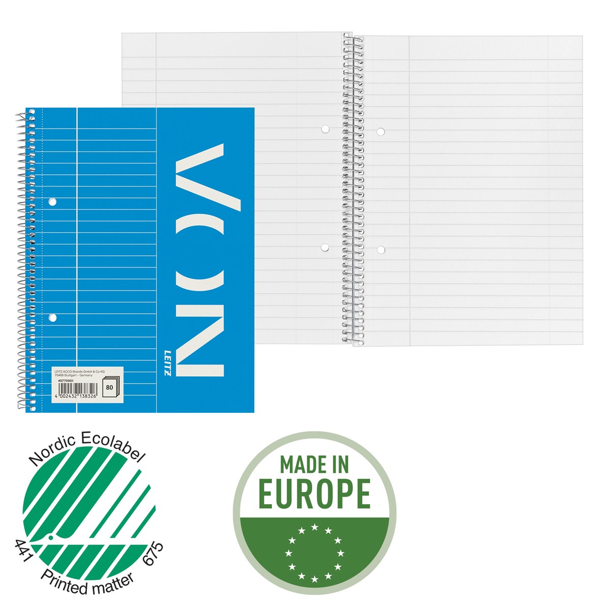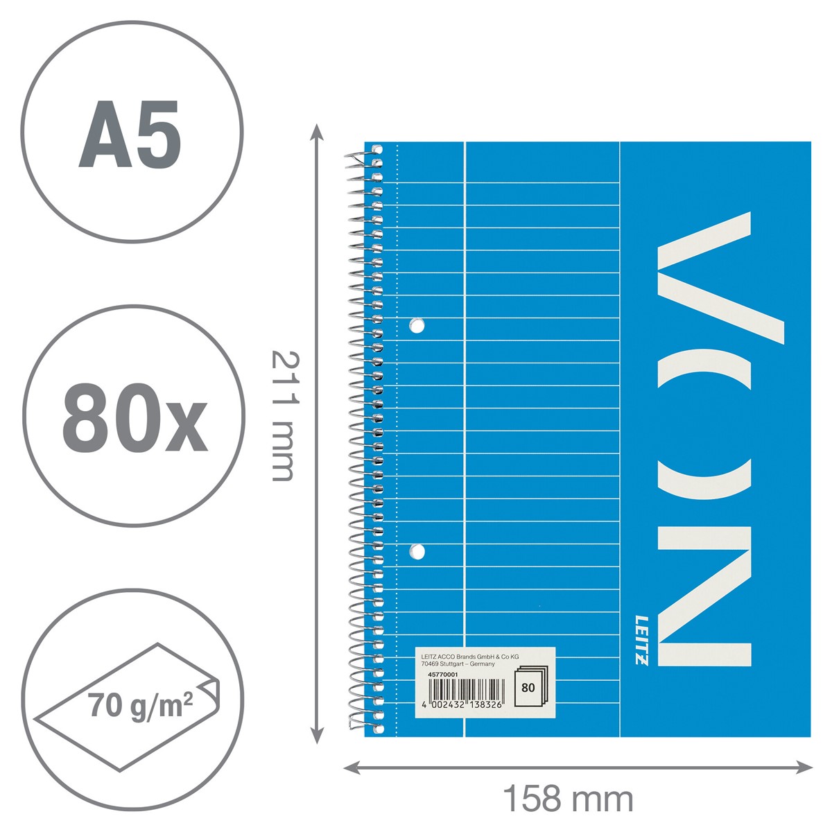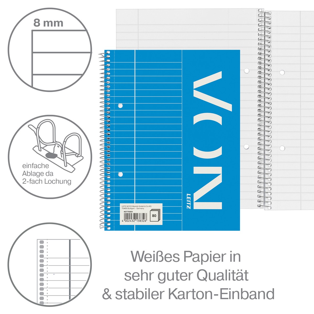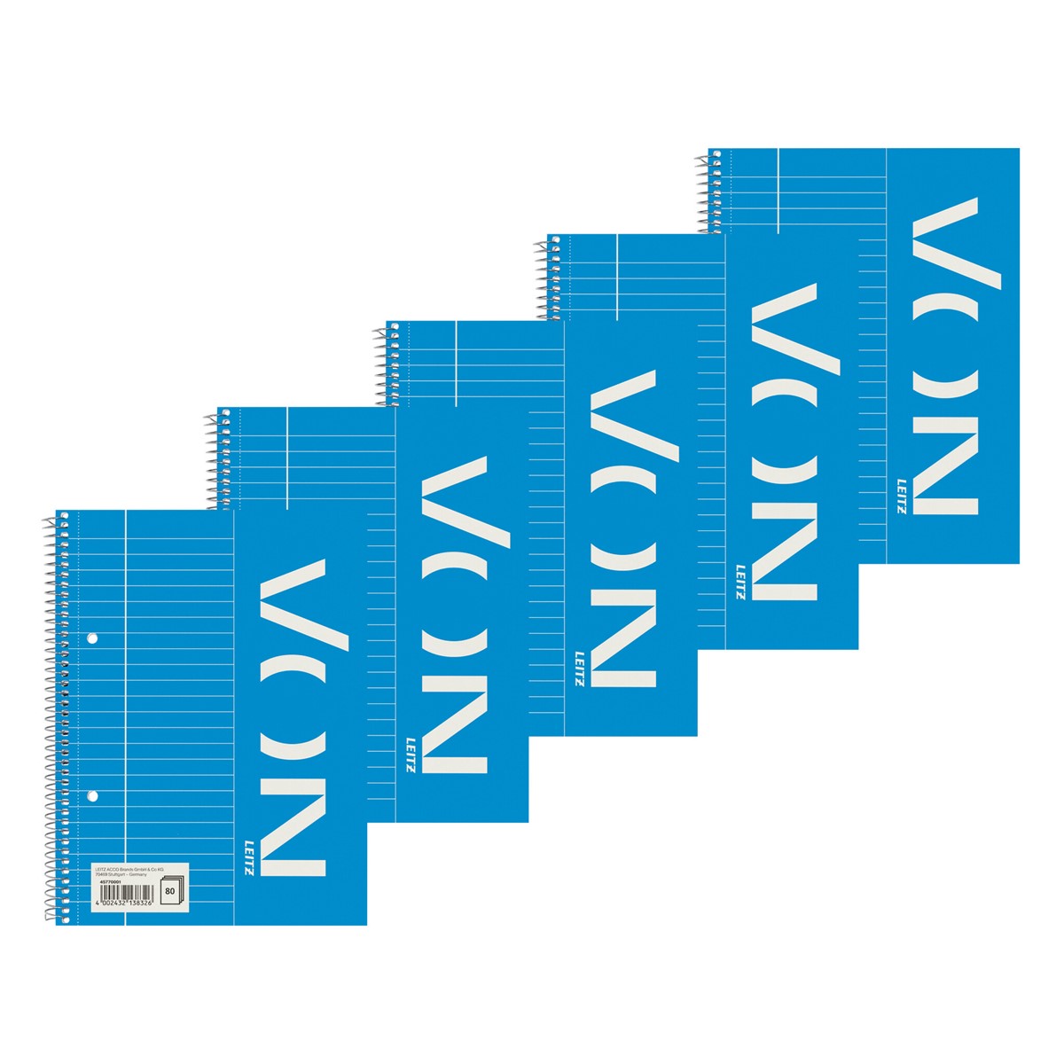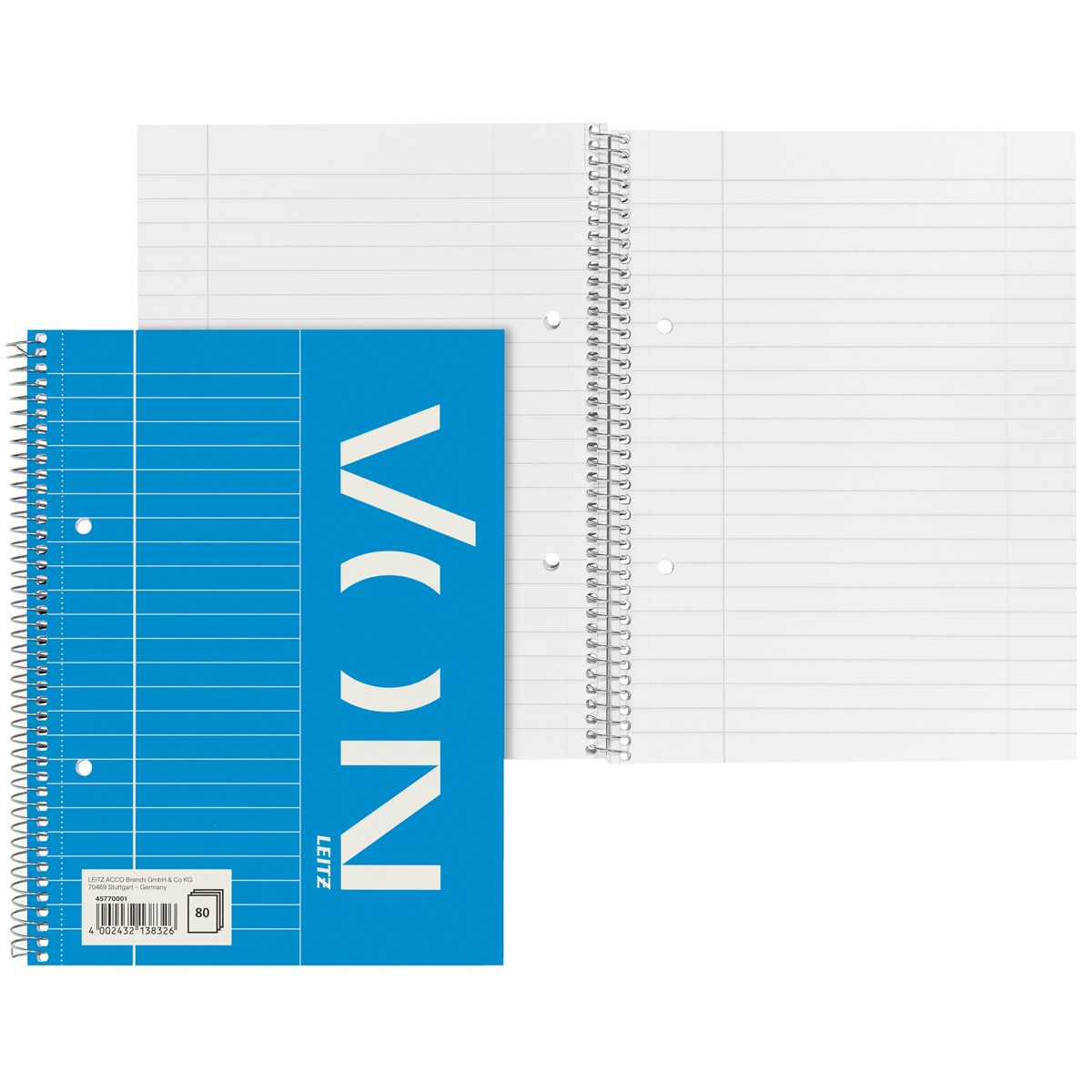 A5 Collegeblock für jeden Tag. 80 Blatt 70 g/m² Papier in sehr guter Qualtiät. Spiralgebunden zum 360°-Öffnen und verfügt über einen Karton-Einband. Liniert 8 mm mit Randline Links. Everyday quality - von Leitz.